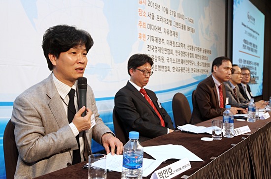 | ▲ 미디어펜·자유경제원 공동주최 '2015 신성장동력 플러스 포럼'이 지난 21일 서울 중구 플라자호텔 그랜드볼룸에서 열렸다. 이날 '한반도 통일의 완성, 한강의 기적 넘어 대동강 기적으로’ 특별좌담에서 박인호 전 데일리NK 북한연구실장(사진 왼쪽)이 발언을 하고 있다. /사진=미디어펜 고이란 기자 | ||
