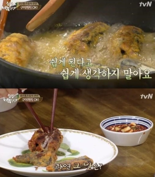 또 백종원은 고등어 통조림을 활용해 생선구이도 선보였다. 먼저 고등어가 살짝 잠길 정도로 식용유를 넉넉하게 붓는다. 이후 체에 거른 고등어를 튀김가루(밀가루도 가능)에 입힌다.
