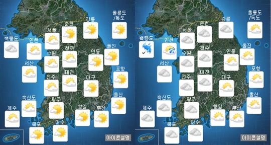 | ▲ 26일 오전(왼쪽)과 오후(오른쪽) 기상 상황./사진=기상청 홈페이지 캡처 |